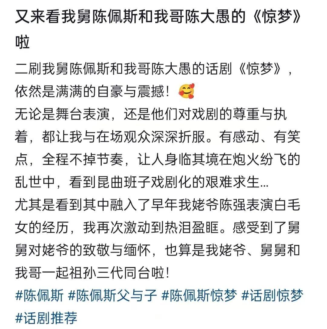 原来,这一天是妹妹一家来二刷陈家父子携手出演的话剧《惊梦》,外甥女张嘉芸在欢娱之余上传了这张合影。
