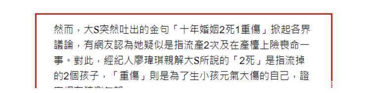 在说完震怒的原因之后,大S终末还说了一句:“十年婚配二死一重伤,刷卡泄愤这事当今念念来太好笑,因为我 借你、付出在你身上的多更多,刷你的卡,花的卻是我我方落索赚來的钱。 ” 好多网友猜对了大S口子的“二死”,便指的是两次流产。但是对“重伤”一词是何意却一时半会猜透不出。随后牙东说念主说念出了真相,“重伤”指的是大S为了生小孩元气大伤的我方。