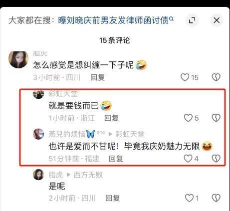 难怪之前有网友看完50岁小男友的茶言茶语之后就说,【这个男的十足是为了要钱,若是钱到位,推测就不会出来瞎扯了,看来庆奶莫得受他的按捺】。