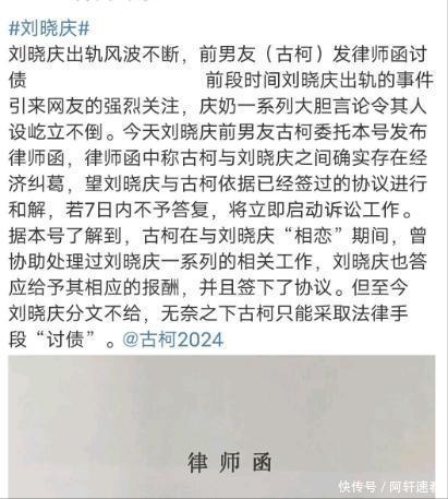 那时刘晓庆说会付给50岁小男友一些酬金,效果活干了,钱却没给,于是古柯决定索债,而且给刘晓庆7日时候准备,否则就法庭见。